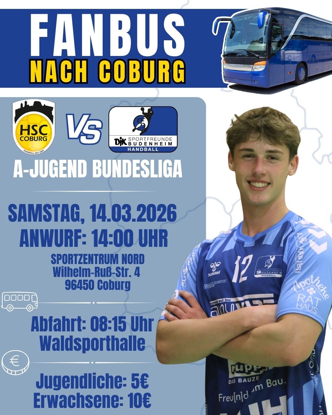 Für das Auswärtsspiel in Coburg setzt der Verein einen Fanbus ein. Abfahrt ist am Samstag um 8:15 Uhr an der Waldsporthalle. Kurzentschlossene können noch mitfahren – im Bus sind noch Plätze frei. Gerade zum nun kurzfristig letzten Saisonspiel freut sich die Mannschaft über möglichst viele Budenheimer Supporter in Coburg.