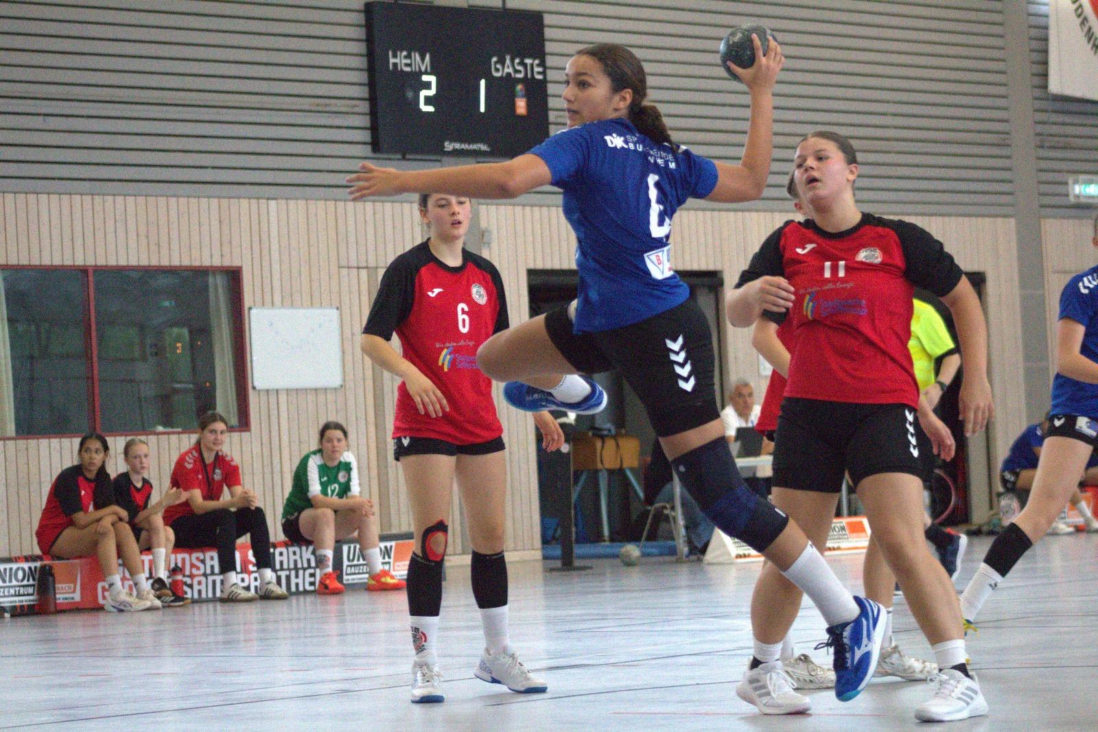 Die Mädchen der MJSG hatten sich viel vorgenommen, kamen aber nicht gut in die Partie. Zu fahrlässig und passiv, so dass das Trainergespann bereits nach knapp 4 Minuten die erste Auszeit nahm. Danach ging es etwas konzentrierter, fokussierter weiter. Der unbändige Wille auf den Sieg war indes von Anfang an spürbar. So setzten sich die U15 Mädels der MJSG, nach einem ausgeglichenen Beginn, nach rund zwölf Minuten erstmals mit drei Toren ab (4:1). Die Gastgeberinnen aus de Pfalz kämpften, doch die MJSG hielt dagegen – mit Cleverness, Einsatz und Teamspirit. Zur Halbzeit stand es 10:8 für die Gäste – eine verdiente, aber hart erarbeitete Führung.